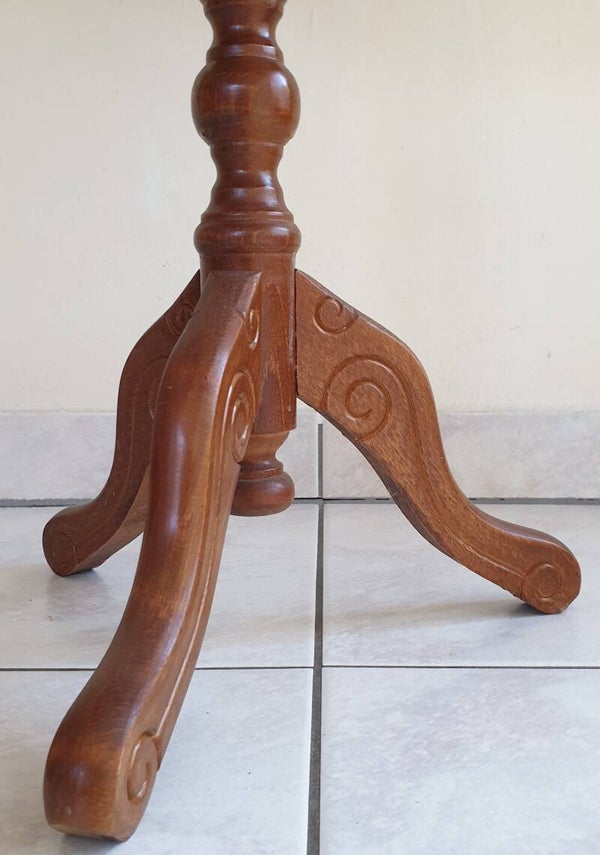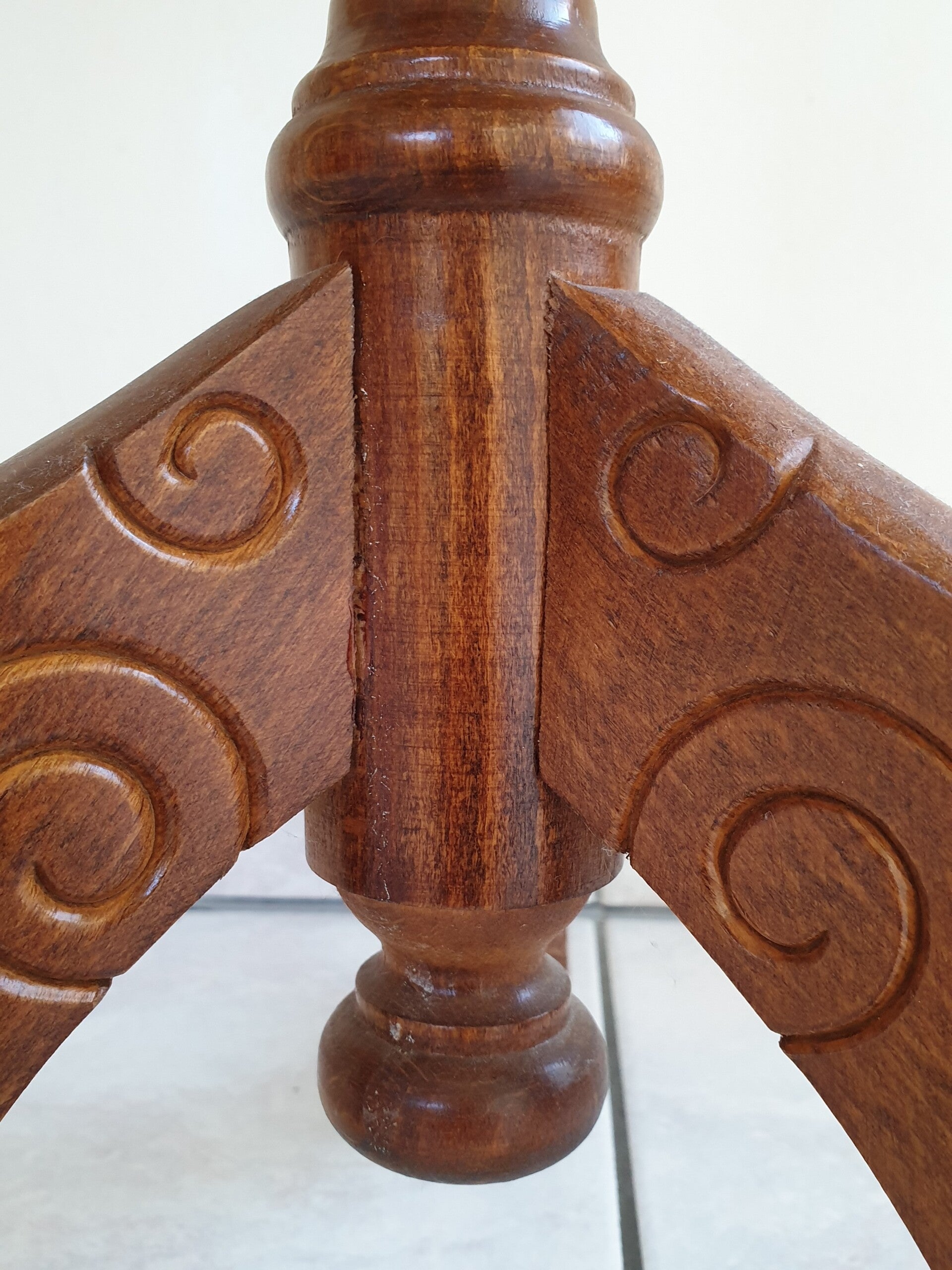 Aufwendig restauriertes und handpoliertes Blumentischchen, wunderbare Einlegearbeit auf Tischfläche und Schnitzereien an den Beinen.