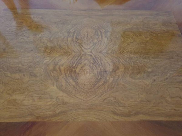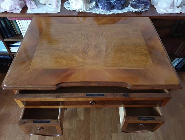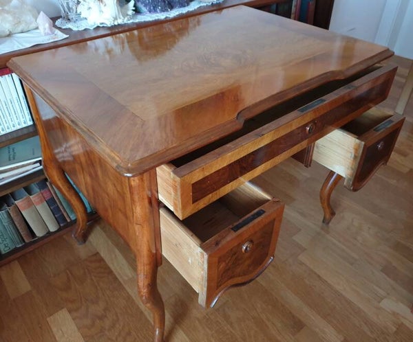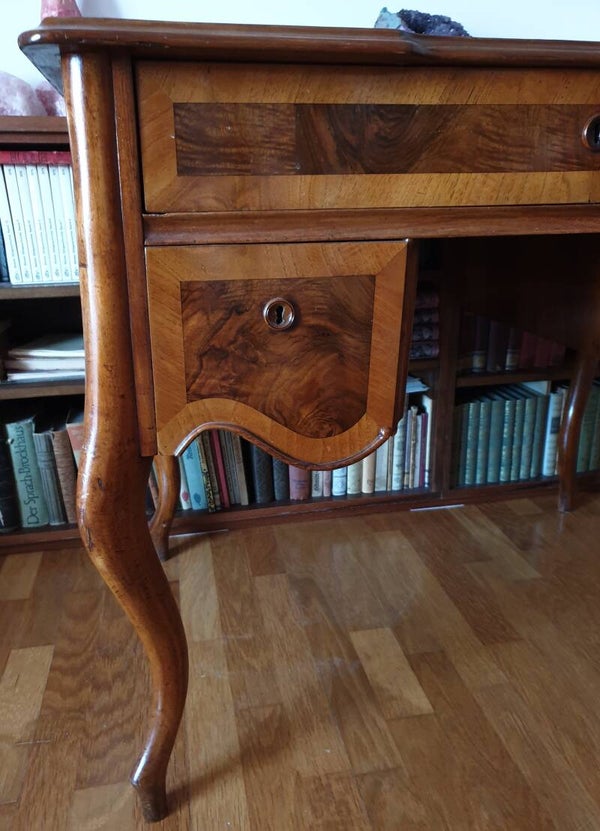 Schreibfläche mit Einlegearbeit, eine große Lade, 2 kleinere hohe Laden. Geschwungene Beine.