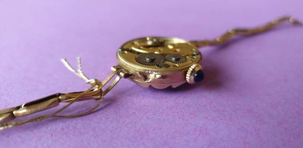 Handaufzug. Uhrwerk optisch OK, funktioniert aber nicht. Wird daher als nicht funktionsfähig verkauft.