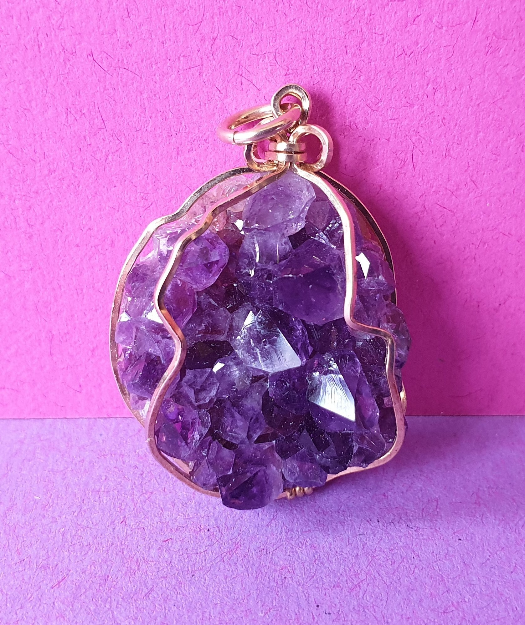 Ausdrucksstarker Kettenanhänger mit einem goldfarben gefassten Naturstein Amethysten in 3 cm Länge