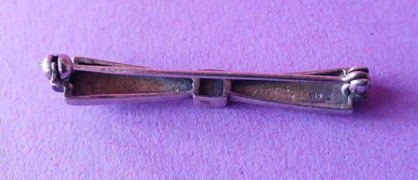 4,2 cm lange Brosche aus 925 Silber. Form einer Masche mit schwarzem Edelstein mittig und silber gearbeiteten Steinen außen