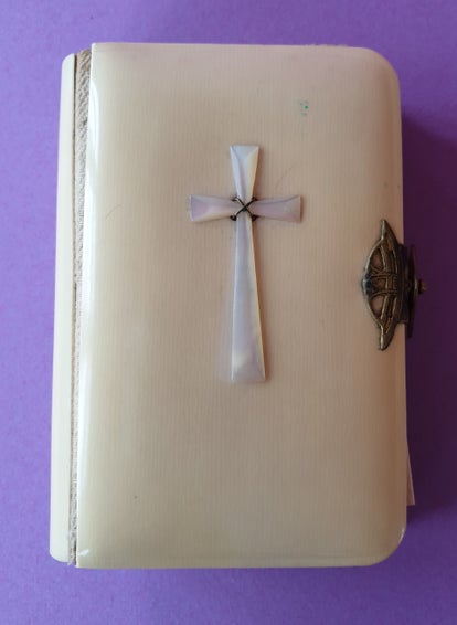 Buch aus Bakelit, Kreuz aus Bein, Messingbeschlag, Seiten mit Goldeinfassung. Inklusive Originalschachtel